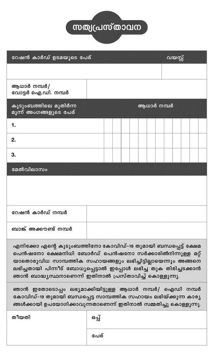 ഉദ്യോഗസ്ഥൻ നിങ്ങളുടെ വീടുകളിലേക്ക് പണവുമായി വരുമ്പോൾ ഈ പൂരിപ്പിച്ച സത്യപ്രസ്താവന നൽകേണ്ടതുണ്ട്. ഈ സത്യപ്രസ്താവന എവിടെ നിന്ന് ലഭിക്കും എന്നും അത് പൂരിപ്പിക്കേണ്ട രീതിയും തുടർന്ന് വിവരിച്ചിട്ടുണ്ട്. താഴെ കൊടുത്തിട്ടുള്ള ലിങ്കിൽ നിന്നും സത്യപ്രസ്താവന പ്രിന്റ് എടുക്കാം. ഇതിൽ റേഷൻ ഉടമയുടെ പേര്, വയസ്സ്, കുടുംബത്തിലെ 3 മുതിര്ന്ന അംഗങ്ങളുടെ പേര്, ആധാര് കാര്ഡ് നമ്പര്, ആധാർ കാർഡ് നമ്പർ, മേല്വിലാസം, റേഷന് കാര്ഡ് നമ്പര്, ബാങ്ക് അക്കൗണ്ട് നമ്പര്, പിന്നീട് അതില് പറയുന്ന 2 കാര്യങ്ങള് വായിച്ചതിന് ശേഷം ഒപ്പിടുക. ഇത് നിങ്ങളുടെ വീട്ടില് പണവുമായി വരുന്ന ഉദ്യോഗസ്ഥര്ക്ക് കൊടുക്കുക.