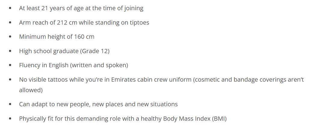 ക്യാബിൻ ക്രൂ തസ്തികയിലേക്ക് അപേക്ഷിക്കാനുള്ള വിദ്യാഭ്യാസ യോഗ്യത പ്ലസ്ടു ആണ്. ഇംഗ്ലീഷ് നന്നായി എഴുതാനും സംസാരിക്കാനും അറിഞ്ഞിരിക്കണം, ഉയരം കുറഞ്ഞ 160 സെൻറീമീറ്റർ, പ്രായം 21 വയസ്സിനു മുകളിൽ ഉണ്ടായിരിക്കണം.