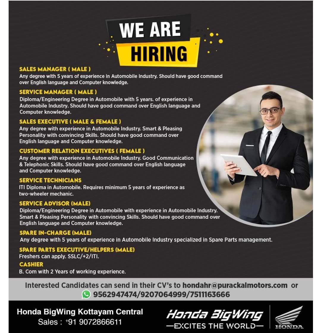 കാഷ്യർ തസ്തികയിൽ ബികോം കഴിഞ്ഞവർക്കും കുറഞ്ഞത് രണ്ടു വർഷത്തെ പ്രവൃത്തിപരിചയം ഉള്ളവർക്കും ആണ് യോഗ്യത. താല്പര്യമുള്ളവർ അവരുടെ CV എന്ന hondahr@purackalmotors.com വിലാസത്തിലോ 9562947474/9207064999/7511163666 എന്ന വാട്സ്ആപ്പ് നമ്പറിലോ അയക്കുക.