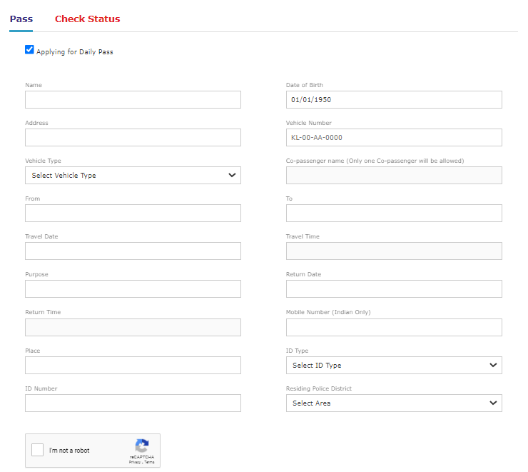 പാസ്സിന് വേണ്ടി അപ്ലൈ ചെയ്യാനായി “PASS” “CHECK STATUS” എന്നിങ്ങനെ രണ്ട് ഓപ്ഷനുകൾ കാണാം. ദിവസവും നിങ്ങൾക്ക് പോകേണ്ട ആവശ്യത്തിനാണ് പാസ് എടുക്കുന്നതെങ്കിൽ “Applying for Daily Pass” എന്ന ഓപ്ഷൻ ക്ലിക്ക് ചെയ്യുക. ഇനി താഴെ കൊടുത്തിട്ടുള്ള ഫോമിൽ പേര്, ജനന തീയതി, വിലാസം, സഞ്ചരിക്കുന്ന വണ്ടിയുടെ, മൊബൈൽ നമ്പർ തുടങ്ങി എല്ലാം പൂരിപ്പിക്കുക. ശേഷം “SUBMIT” എന്നതിൽ ക്ലിക്ക് ചെയ്യുക.