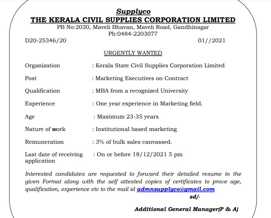 കേരള സിവിൽ സപ്ലൈസ് കോർപ്പറേഷൻ വിജ്ഞാപനം : കേരള സിവിൽ സപ്ലൈസ് കോർപ്പറേഷൻ ലിമിറ്റഡ് പുതിയ റിക്രൂട്ട്മെൻറ് നോട്ടിഫിക്കേഷൻ പ്രസിദ്ധീകരിച്ചിട്ടുണ്ട്. മാർക്കറ്റിംഗ് എക്സിക്യൂട്ടീവ് തസ്തികയിൽ കരാറടിസ്ഥാനത്തിൽ യോഗ്യതയുള്ള ഉദ്യോഗാർത്ഥികളെ നിയമിക്കുന്നതിനായി അപേക്ഷകൾ ക്ഷണിക്കുന്നു. താല്പര്യമുള്ള ഉദ്യോഗാർത്ഥികൾ അപേക്ഷകൾ, ഒപ്പം ആവശ്യമായ രേഖകൾ ഉൾപ്പെടെ താഴെ കൊടുത്തിരിക്കുന്ന ഈമെയിൽ വിലാസത്തിൽ ഡിസംബർ 18, 2021 മുൻപായി അയക്കുക.