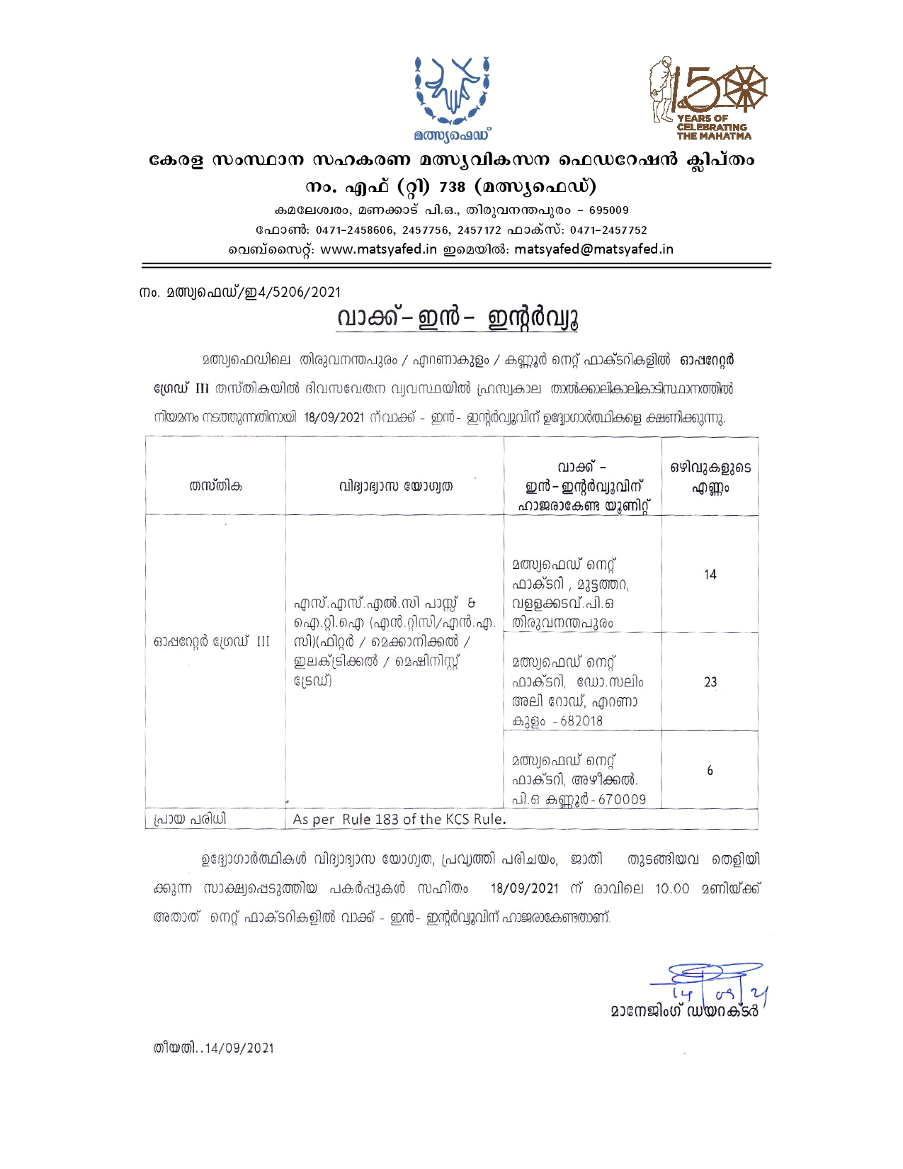 കേരള സ്റ്റേറ്റ് കോ-ഓപ്പറേറ്റീവ് ഫെഡറേഷൻ ഫോർ ഫിഷറീസ് ഡെവലപ്പ്മെന്റ് ലിമിറ്റഡ് (മത്സ്യഫെഡ്) അതിന്റെ ഔദ്യോഗിക വെബ്സൈറ്റ് http://www.matsyafed.in/ മുഖേന ഒരു ഔദ്യോഗിക നോട്ടിഫിക്കേഷൻ പ്രസിദ്ധീകരിച്ചിട്ടുണ്ട്. ഓപ്പറേറ്റർ ഗ്രേഡ് III തസ്തികകളിലേക്ക് 43 ഒഴിവുകൾ നികത്തുന്നതിന് യോഗ്യതയുള്ള ഉദ്യോഗാർത്ഥികളിൽ നിന്ന് വാക്ക് ഇൻ ഇന്റർവ്യൂ വഴി നിയമനത്തിനായി അപേക്ഷകൾ ക്ഷണിക്കുന്നു.