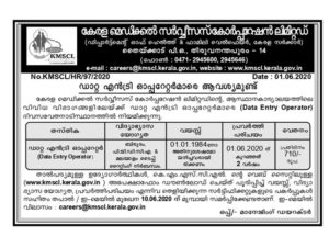 കേരള മെഡിക്കൽ സർവീസ് കോ ഓപ്പറേഷൻ ലിമിറ്റഡ് (ഡിപ്പാർട്മെന്റ് ഓഫ് ഹെൽത്ത് ആൻഡ് ഫാമിലി വെൽഫയർ, കേരള സർക്കാർ) ഡാറ്റ എൻട്രി ഓപ്പറേറ്റർ തസ്തികയിലേക്ക് യോഗ്യതയുള്ള ഉദ്യോഗാർഥികളിൽ നിന്നും അപേക്ഷകൾ ക്ഷണിക്കുന്നു. കേരള മെഡിക്കൽ സർവീസ് കോ ഓപ്പറേഷൻ ലിമിറ്റഡ്-ന്റെ ആസ്ഥാന കാര്യാലയത്തിലേക്കാണ് നിയമനം.ദിവസ വേതന അടിസ്ഥാനത്തിലാകും നിയമിക്കുന്നത്.