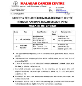 നാഷണൽ ഹെൽത്ത് മിഷൻ മുഖേന മലബാർ കാൻസർ സെന്ററിലേക്ക് ലാബ് ടെക്നിഷ്യൻ ടാറ്റ എൻട്രി ഓപ്പറെറ്റർ തസ്തികകളിൽ ഉദ്യോഗാർഥികളെ ക്ഷണിക്കുന്നു. താല്പര്യമുള്ളവർക്കും യോഗ്യതയുള്ളവർക്കും 10.07.2020 നടക്കുന്ന ഇന്റർവ്യൂയിൽ പങ്കെടുക്കുക. ഇന്റർവ്യൂ സമയം 10 മണി മുതൽ 11 മണി വരെ. കൂടുതൽ വിവരങ്ങൾക്ക് തുടർന്ന് വായിക്കുക.