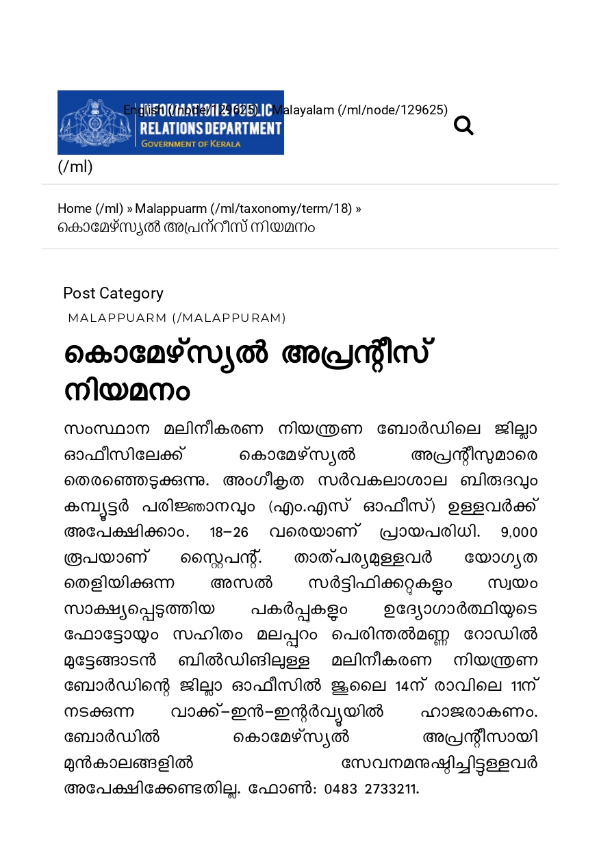 താൽപ്പര്യമുള്ളവരും യോഗ്യതയുള്ളവരുമായ ഉദ്യോഗാർത്ഥികൾ വാക്ക് ഇൻ ഇന്റർവ്യൂവിൽ പങ്കെടുക്കണം, പ്രായം, യോഗ്യത തുടങ്ങിയവ തെളിയിക്കാക്കുന്ന യഥാർത്ഥ സർട്ടിഫിക്കറ്റുകളും സ്വയം സാക്ഷ്യപ്പെടുത്തിയ പകർപ്പുകളും ഫോട്ടോയും, മലപ്പുറം,പെരിന്തൽമണ്ണ റോഡിൽ മുട്ടേങ്ങാടൻ കെട്ടിടത്തിലെ മലിനീകരണ നിയന്ത്രണ ബോർഡ് ഓഫീസിൽ ജൂലൈ 14 ന് രാവിലെ 11 മണിക്ക് മുമ്പ് സമർപ്പിക്കുക. കൊമേഴ്സ്യൽ അപ്രന്റിസ് ആയി മുൻപ് സേവനമനുഷ്ഠിച്ചവർ അപേക്ഷിക്കേണ്ടതില്ല. ഫോണ് : 0483 2733211.