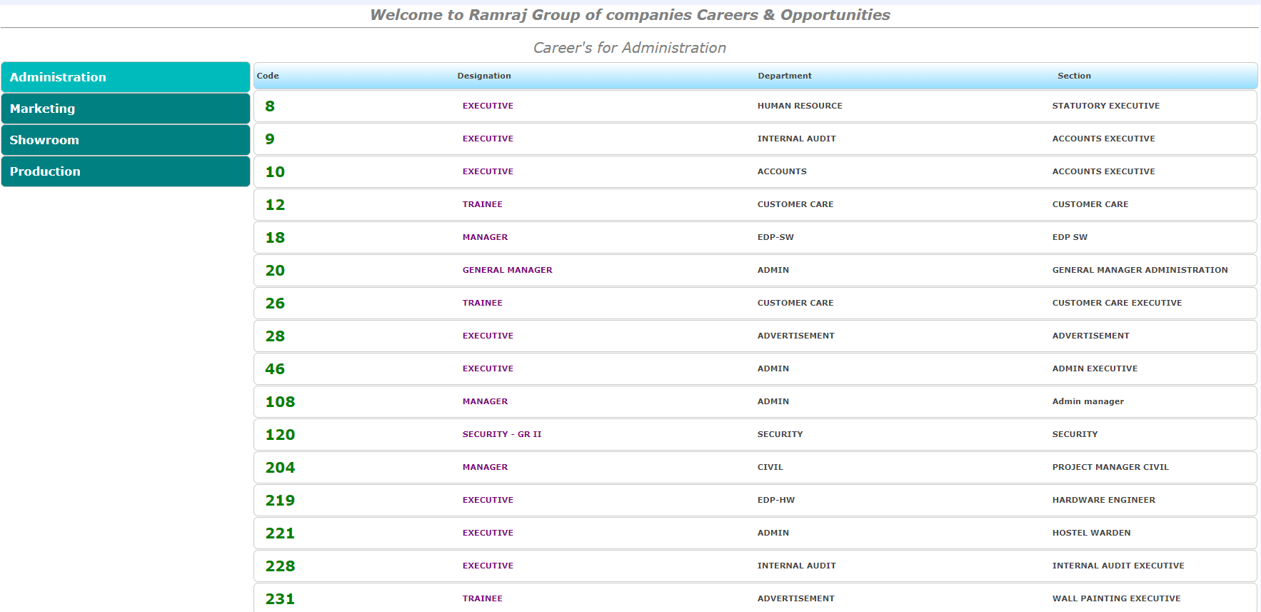 വിവിധ വകുപ്പുകളിൽ എക്സിക്യൂട്ടീവ്, ട്രെയിനി, മാനേജർ, സെക്യൂരിറ്റി, ജനറൽ മാനേജർ, ഡ്രൈവർ തുടങ്ങി ഒഴിവുള്ള തസ്തികകളെ പറ്റി കൂടുതൽ വിവരങ്ങൾ മനസ്സിലാക്കാനും ഓൺലൈൻ ആയി അപേക്ഷിക്കാനും “www.ramrajcotton.in” എന്ന വെബ്സൈറ്റിൽ പ്രവേശിക്കുക. ശേഷം “careers” എന്ന ഓപ്ഷൻ ക്ലിക്ക് ചെയ്യുക. ഇനി ഓപ്പൺ ആയി വരുന്ന പേജിൽ നിരവധി തസ്തികകളും അതിൻറെ വകുപ്പ്, സെക്ഷൻ എന്നിവ കാണാൻ സാധിക്കും.